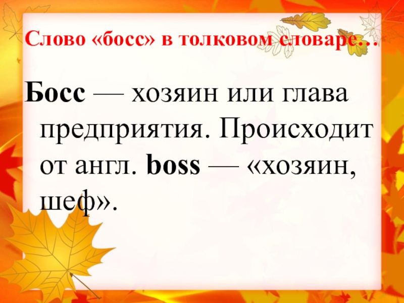 Слово «босс» в толковом словаре…Босс — хозяин или глава предприятия. Происходит от англ. boss — «хозяин, шеф».