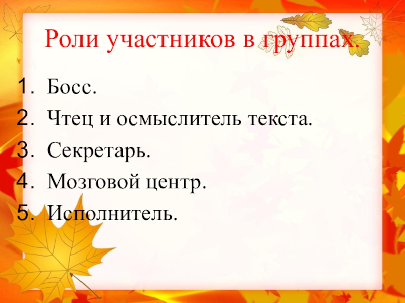 Роли участников в группах.Босс.Чтец и осмыслитель текста.Секретарь.Мозговой центр.Исполнитель.