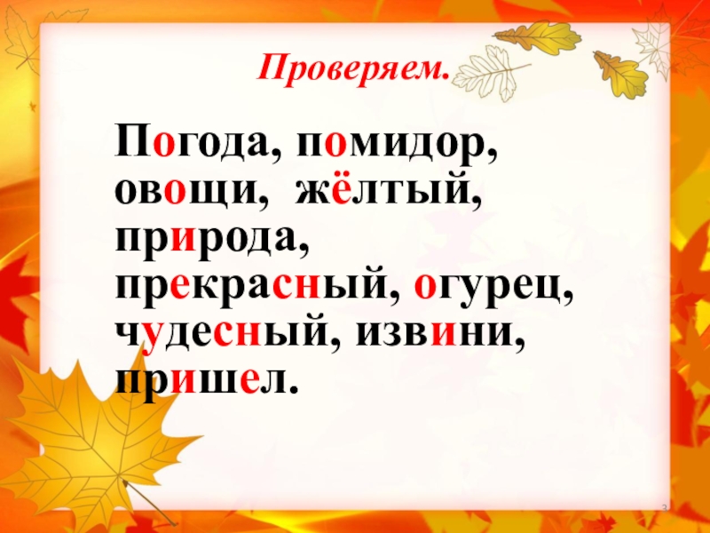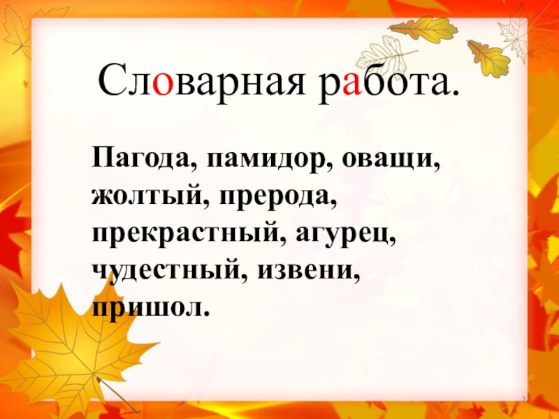 Словарная работа.Пагода, памидор, оващи, жолтый, прерода, прекрастный, агурец, чудестный, извени, пришол.