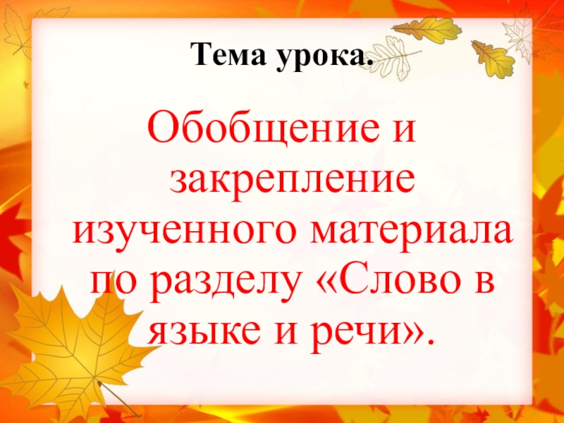 Тема урока.Обобщение и закрепление изученного материала по разделу «Слово в языке и речи».