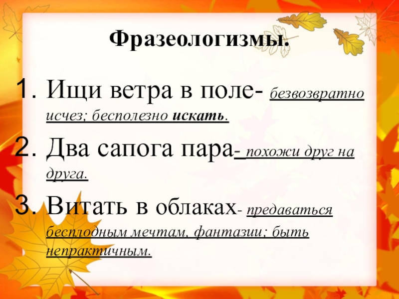 Фразеологизмы.Ищи ветра в поле- безвозвратно исчез; бесполезно искать.Два сапога пара- похожи друг на друга.Витать в облаках- предаваться бесплодным мечтам,
