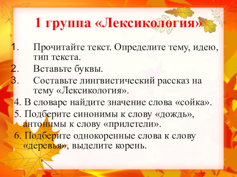 1 группа «Лексикология»Прочитайте текст. Определите тему, идею, тип текста.Вставьте буквы.Составьте лингвистический рассказ на тему «Лексикология».4. В словаре