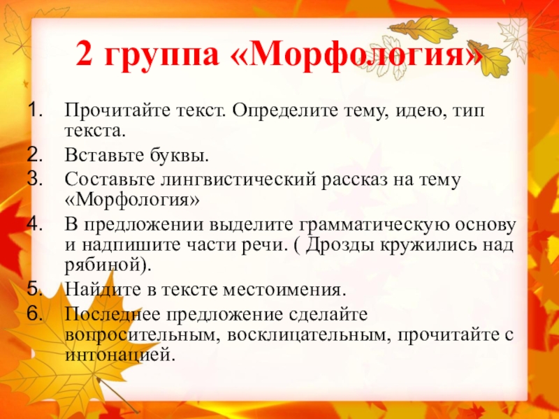 2 группа «Морфология»Прочитайте текст. Определите тему, идею, тип текста.Вставьте буквы.Составьте лингвистический рассказ на тему «Морфология»В предложении выделите