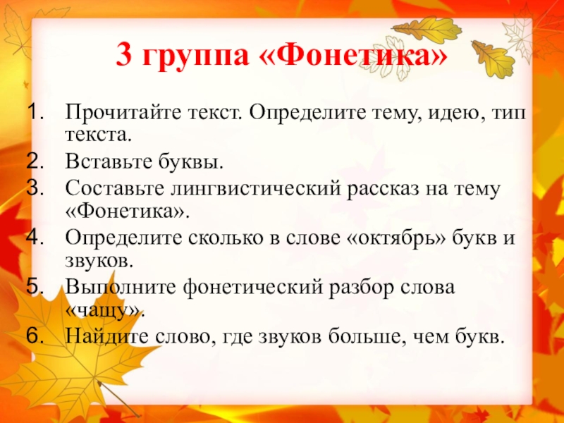 3 группа «Фонетика»Прочитайте текст. Определите тему, идею, тип текста.Вставьте буквы.Составьте лингвистический рассказ на тему «Фонетика».Определите сколько в