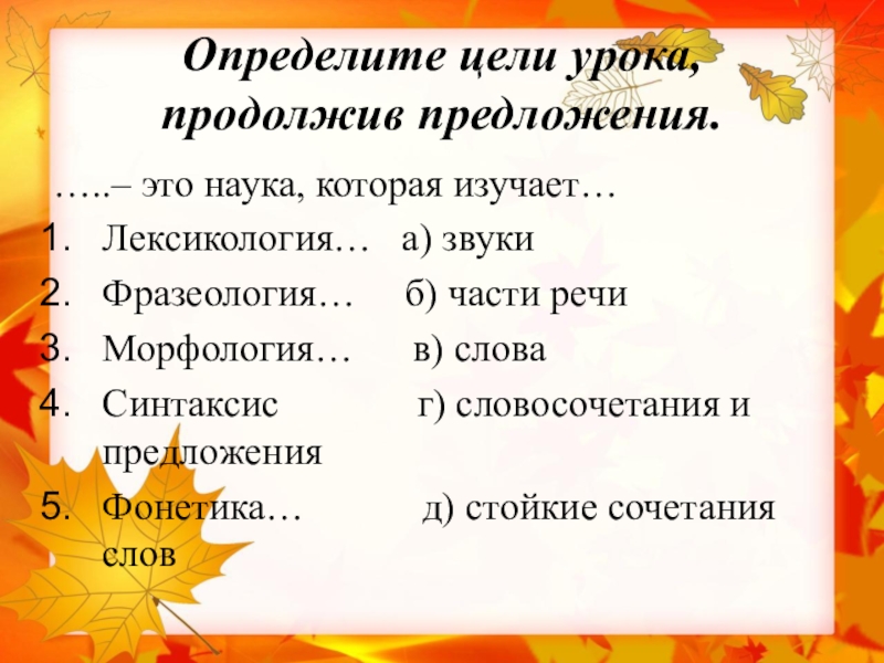 Определите цели урока,  продолжив предложения.…..– это наука, которая изучает…Лексикология…  а) звукиФразеология…   б) части