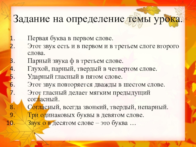 Задание на определение темы урока.Первая буква в первом слове.Этот звук есть и в первом и в третьем