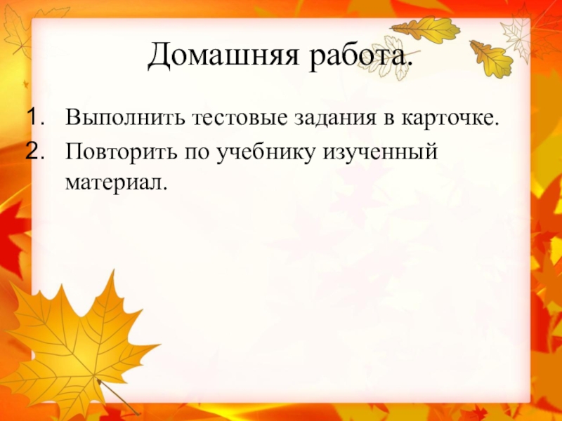 Домашняя работа.Выполнить тестовые задания в карточке.Повторить по учебнику изученный материал.