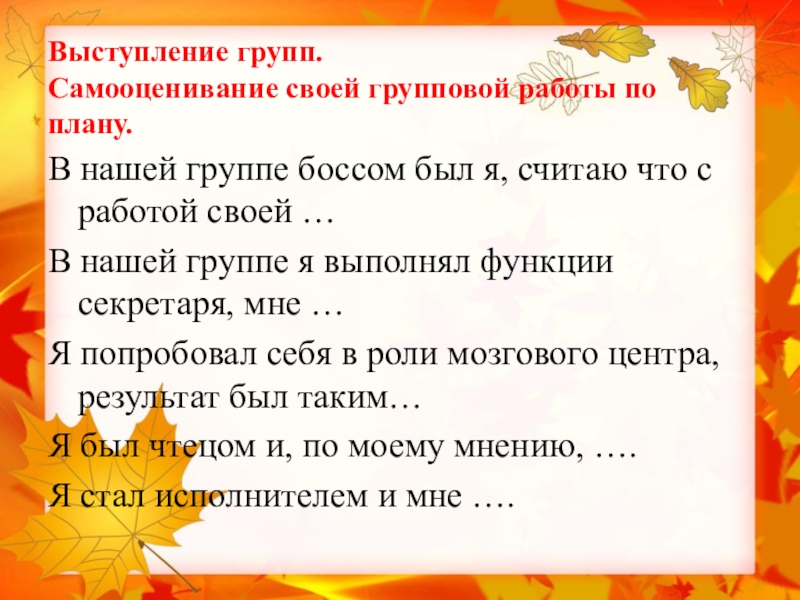Слайд 18Выступление групп. Самооценивание своей групповой работы по плану.