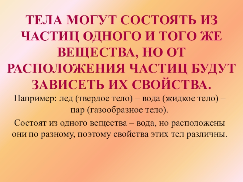 Состоят из одного вещества – вода, но расположены они по разному, поэтому свойства этих тел различны.