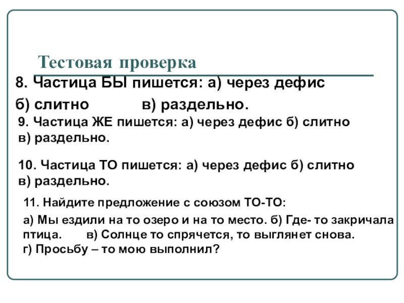10. Частица ТО пишется: а) через дефис б) слитно в) раздельно.