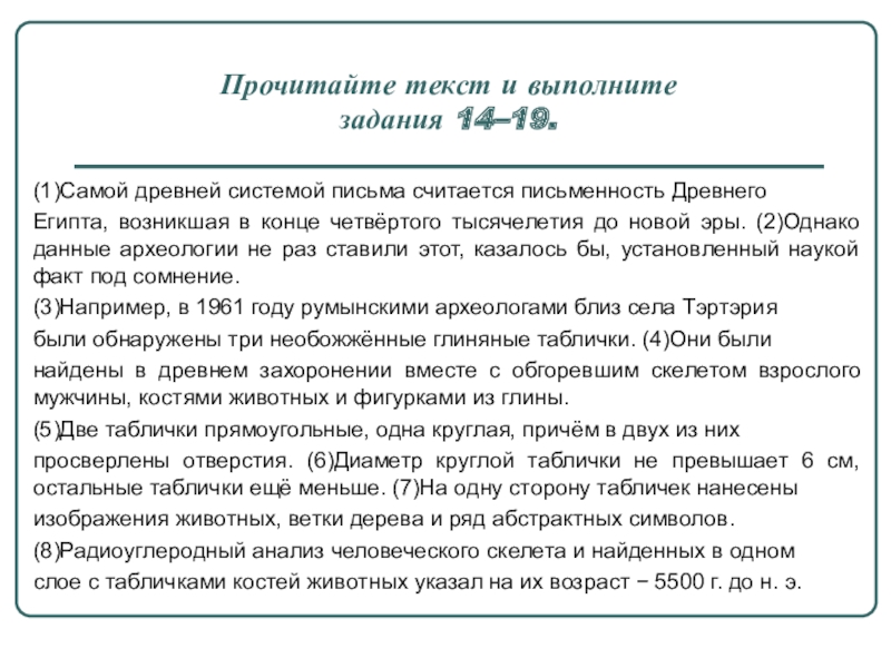 (8)Радиоуглеродный анализ человеческого скелета и найденных в одном слое с табличками костей животных указал на их возраст − 5500 г. до н. э.