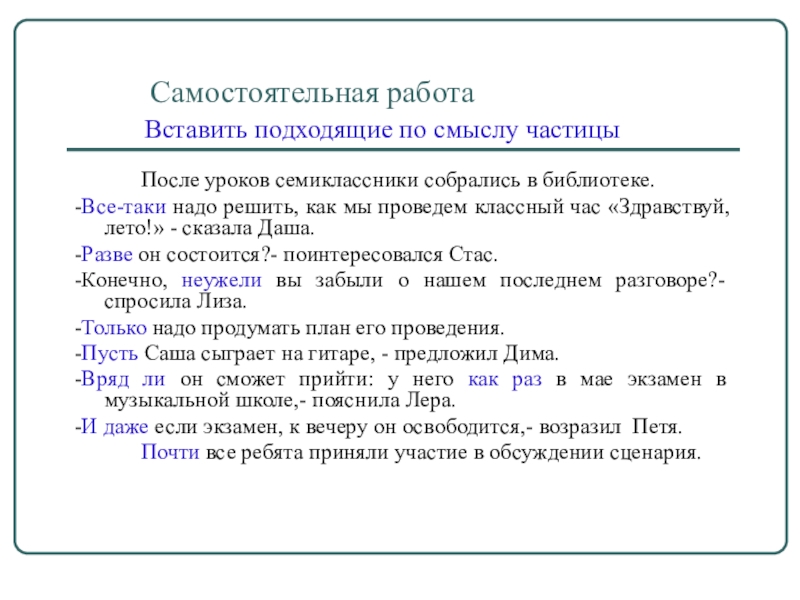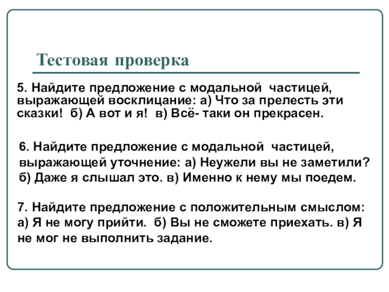 6. Найдите предложение с модальной частицей, выражающей уточнение: а) Неужели вы не заметили? б) Даже я слышал это. в) Именно к нему мы поедем.
