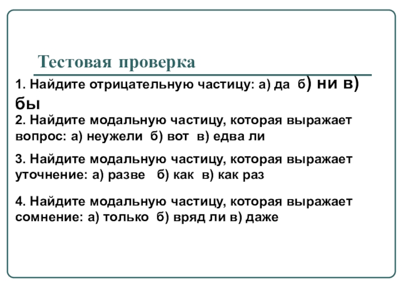 3. Найдите модальную частицу, которая выражает уточнение: а) разве б) как в) как раз