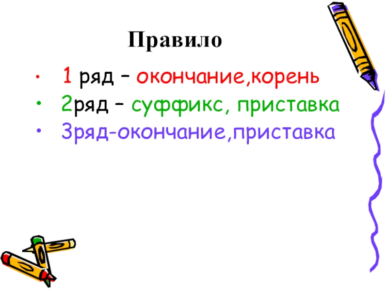 Правило  1 ряд – окончание,корень 2ряд – суффикс, приставка 3ряд-окончание,приставка