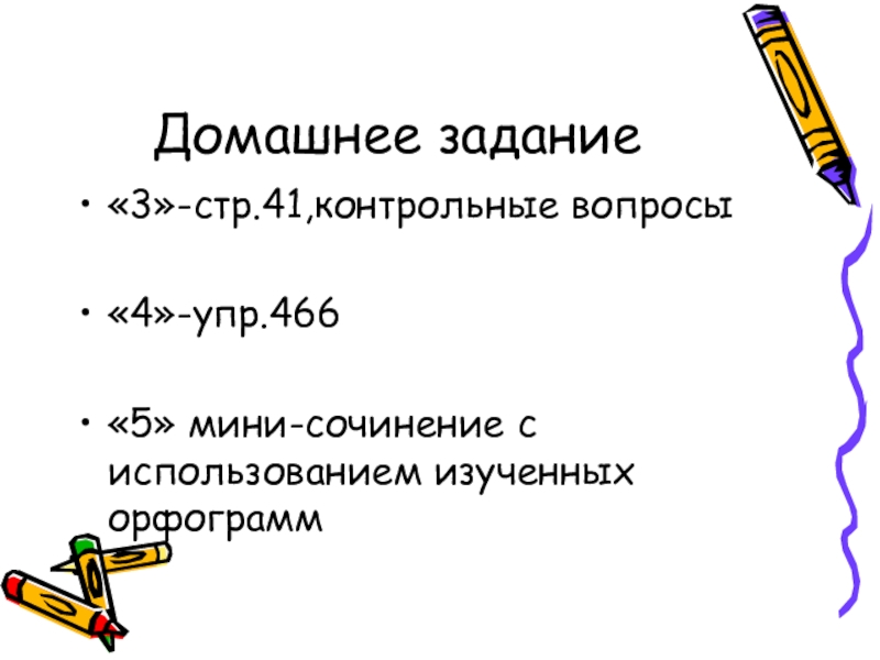 Домашнее задание«3»-стр.41,контрольные вопросы«4»-упр.466«5» мини-сочинение с использованием изученных орфограмм