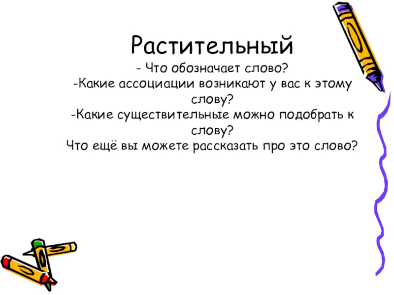Слайд 3Растительный - Что обозначает слово? -Какие ассоциации возникают у вас к этому слову? -Какие