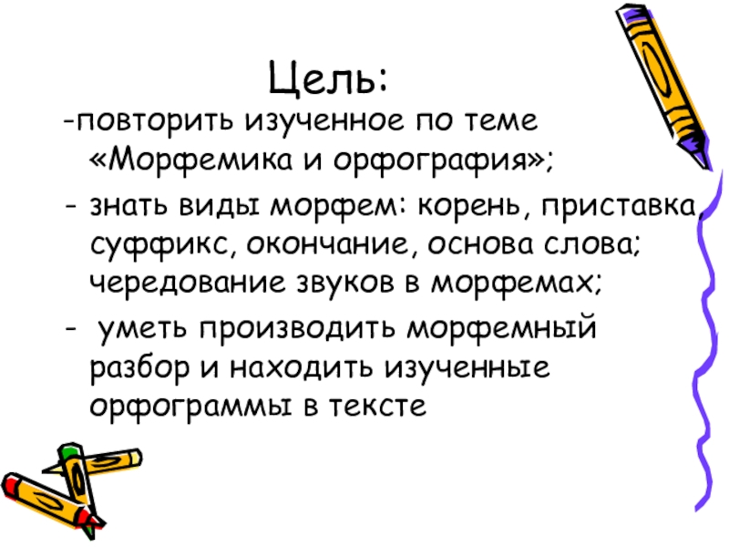 Цель:-повторить изученное по теме «Морфемика и орфография»;знать виды морфем: корень, приставка, суффикс, окончание, основа слова; чередование звуков