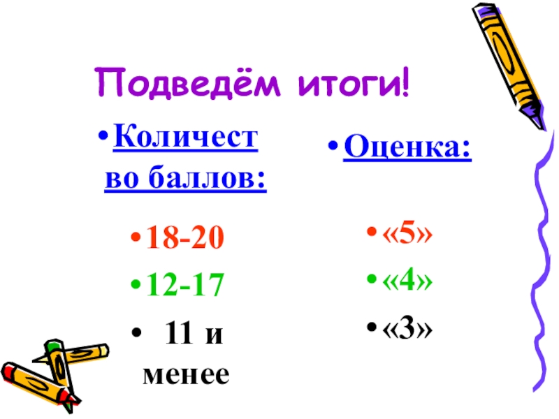Подведём итоги!Количество баллов:18-20    12-17 11 и менееОценка:«5»«4»«3»