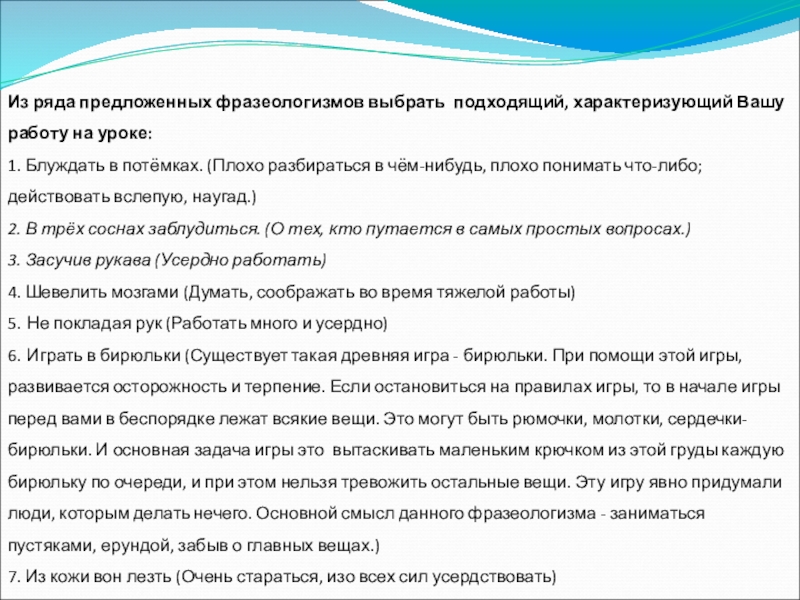 Слайд 13Из ряда предложенных фразеологизмов выбрать подходящий, характеризующий Вашу работу на уроке: