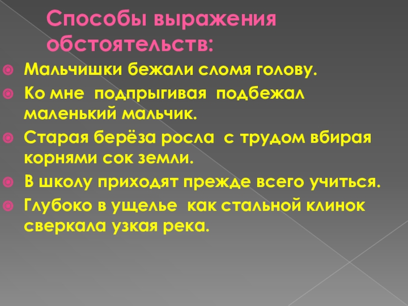 Способы выражения обстоятельств: Мальчишки бежали сломя голову.Ко мне подпрыгивая подбежал маленький мальчик.Старая берёза росла с трудом вбирая корнями сок земли.В школу приходят прежде всего учиться.Глубоко в ущелье как стальной клинок сверкала узкая река.
