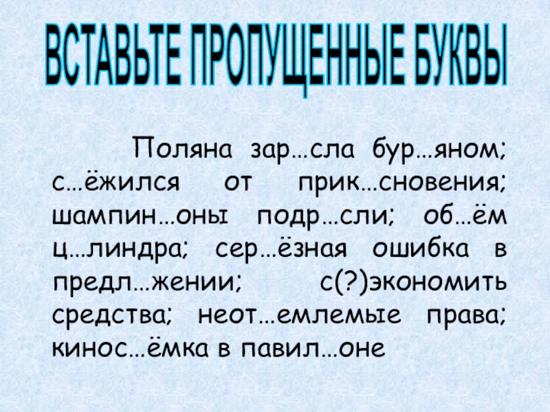 ВСТАВЬТЕ ПРОПУЩЕННЫЕ БУКВЫ   Поляна зар…сла бур…яном; с…ёжился от прик…сновения; шампин…оны подр…сли; об…ём ц…линдра; сер…ёзная ошибка