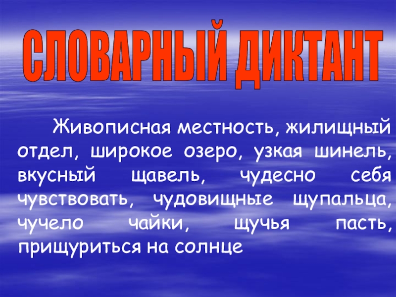 СЛОВАРНЫЙ ДИКТАНТ   Живописная местность, жилищный отдел, широкое озеро, узкая шинель, вкусный щавель, чудесно себя чувствовать,