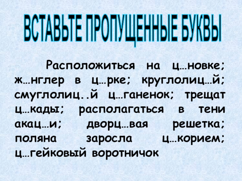 ВСТАВЬТЕ ПРОПУЩЕННЫЕ БУКВЫ  Расположиться на ц…новке; ж…нглер в ц…рке; круглолиц…й; смуглолиц..й ц…ганенок; трещат ц…кады; располагаться в
