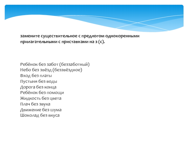 замените существительное с предлогом однокоренными прилагательными с приставками на з (с).Ребёнок без забот (беззаботный)Небо без звёзд (беззвёздное)Вход