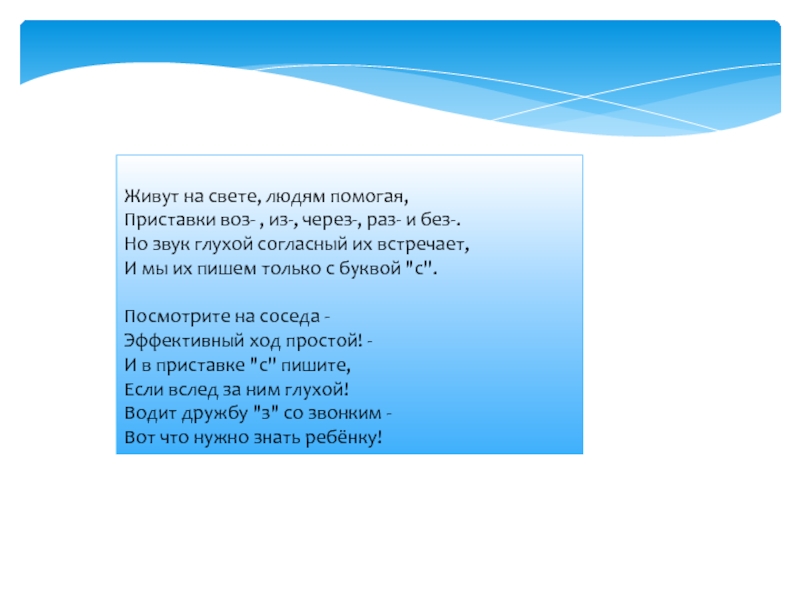 Живут на свете, людям помогая,Приставки воз- , из-, через-, раз- и без-.Но звук глухой согласный их встречает,И мы их пишем только с буквой "с".Посмотрите на соседа -Эффективный ход простой! -И в приставке "с" пишите,Если вслед за
