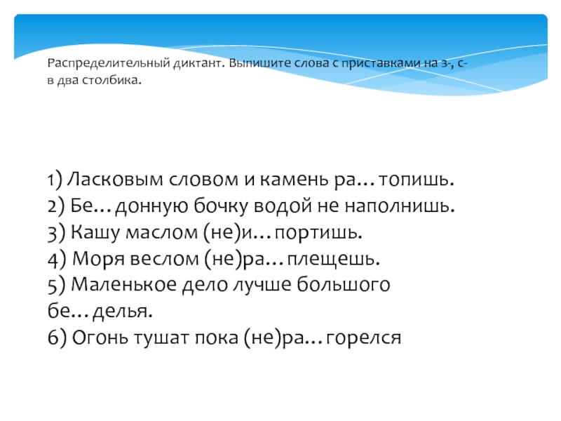 Распределительный диктант. Выпишите слова с приставками на з-, с-  в два столбика. 1) Ласковым словом и
