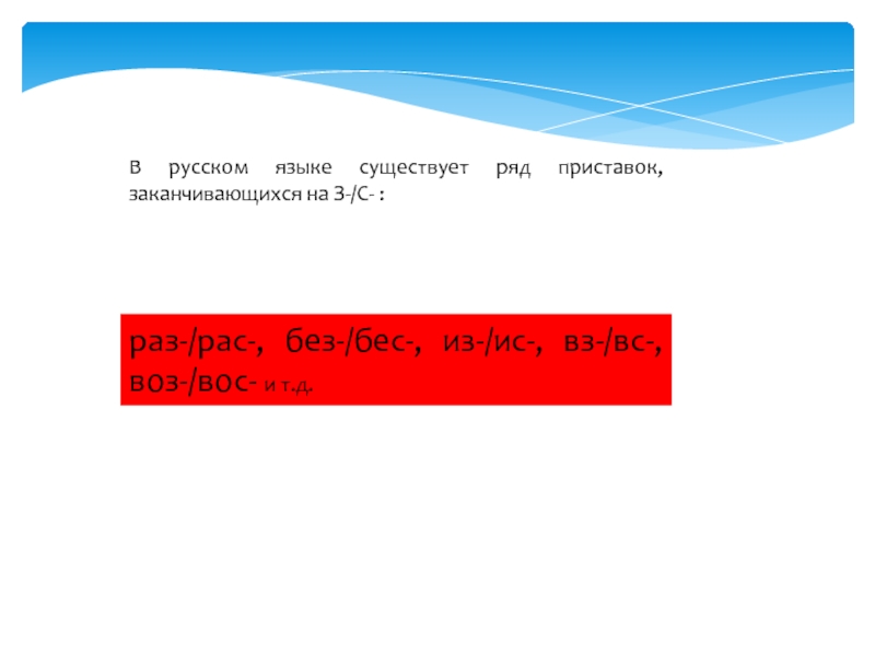 Слайд 3В русском языке существует ряд приставок, заканчивающихся на З-/С- :