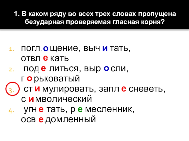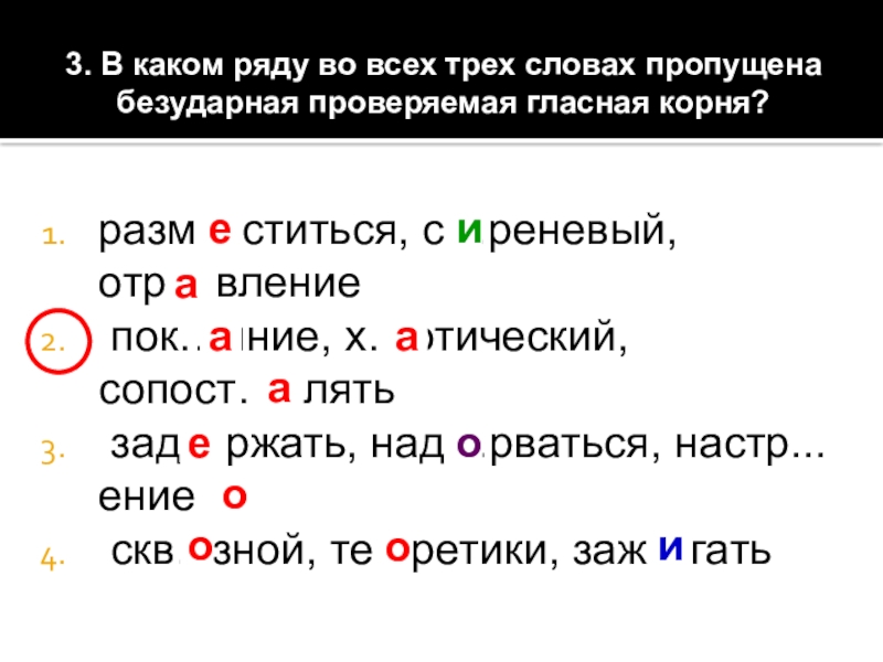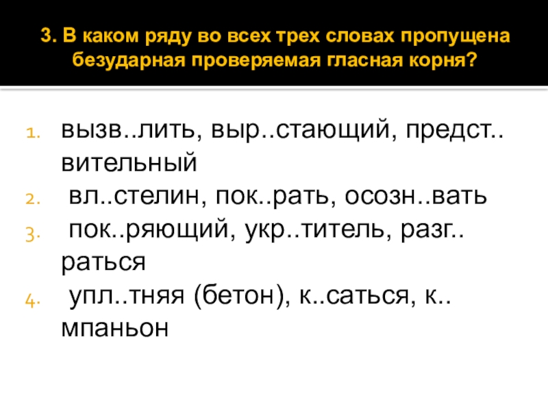 3. В каком ряду во всех трех словах пропущена безударная проверяемая гласная корня?