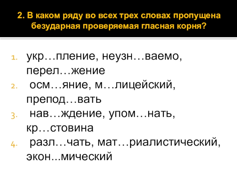 2. В каком ряду во всех трех словах пропущена безударная проверяемая гласная корня?