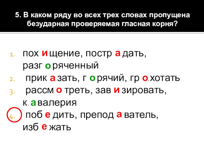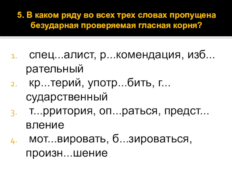 5. В каком ряду во всех трех словах пропущена безударная проверяемая гласная корня?