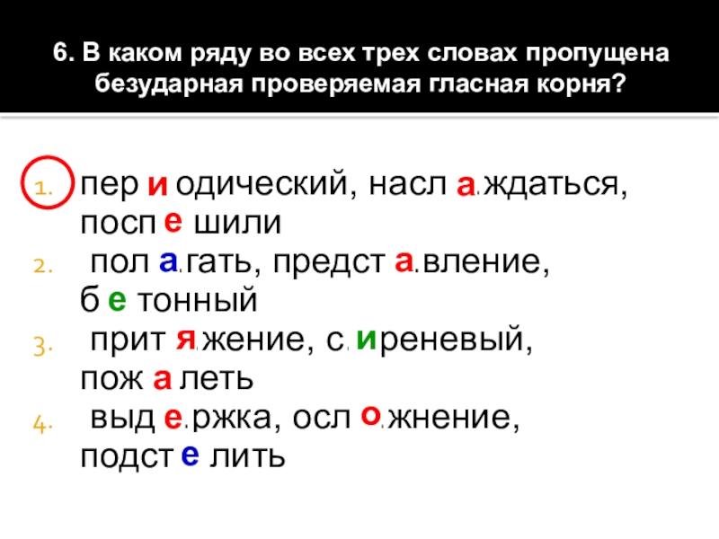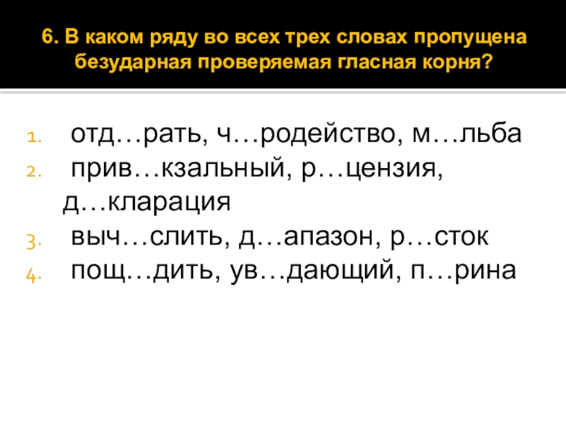 6. В каком ряду во всех трех словах пропущена безударная проверяемая гласная корня?