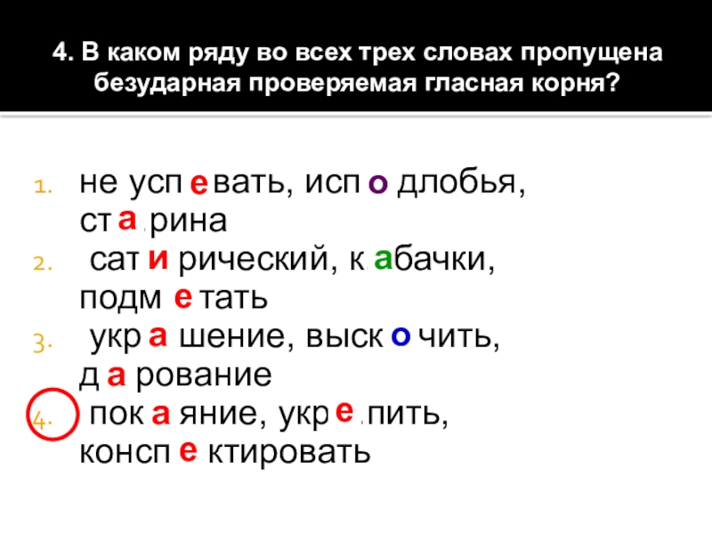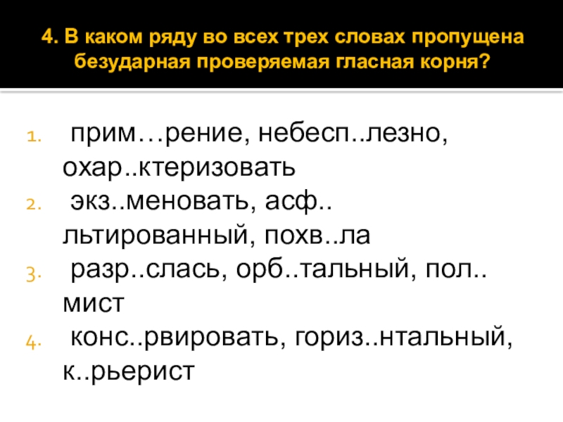4. В каком ряду во всех трех словах пропущена безударная проверяемая гласная корня?