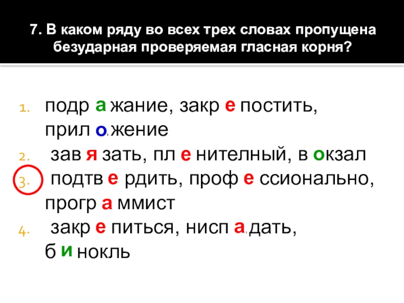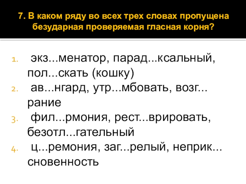 7. В каком ряду во всех трех словах пропущена безударная проверяемая гласная корня?