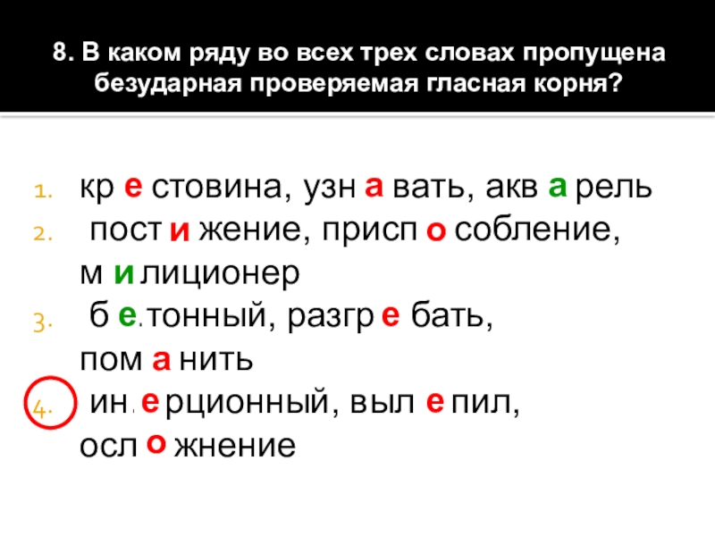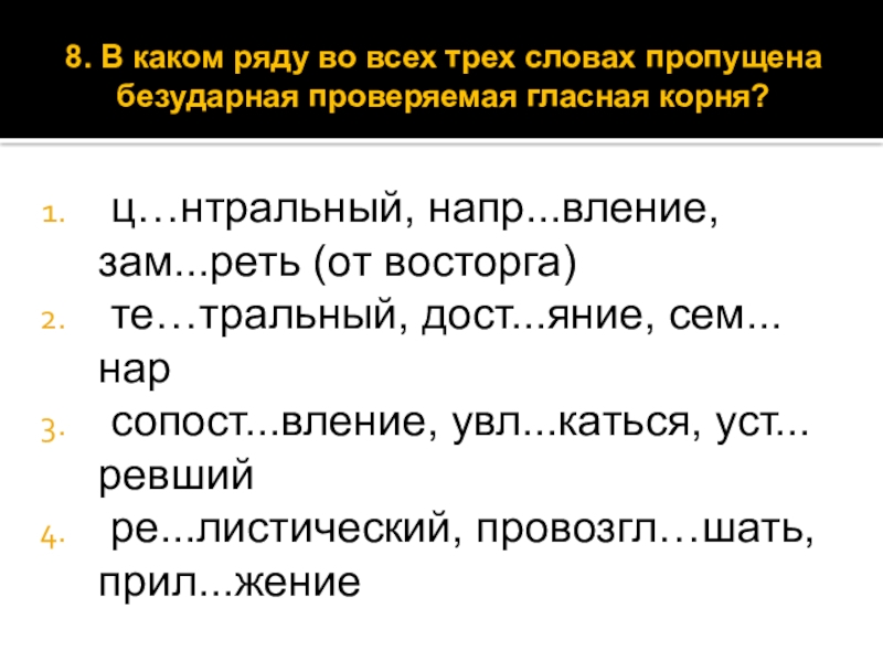 8. В каком ряду во всех трех словах пропущена безударная проверяемая гласная корня?
