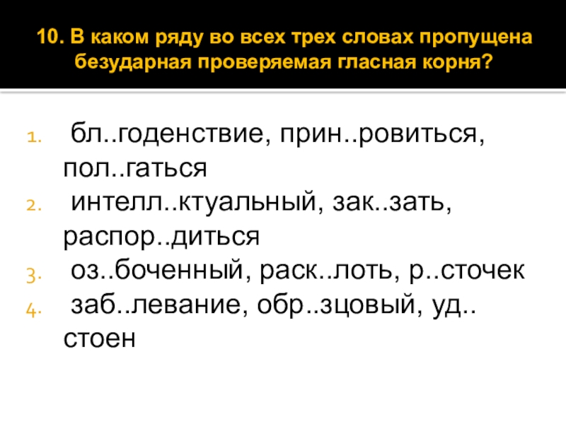 10. В каком ряду во всех трех словах пропущена безударная проверяемая гласная корня?