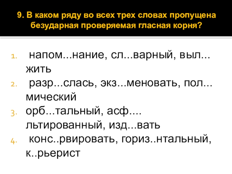 9. В каком ряду во всех трех словах пропущена безударная проверяемая гласная корня?
