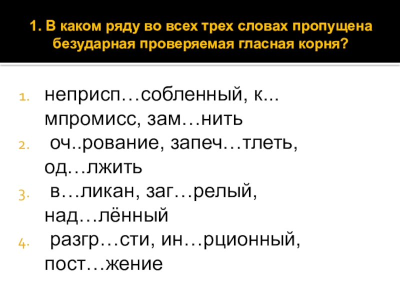 1. В каком ряду во всех трех словах пропущена безударная проверяемая гласная корня?