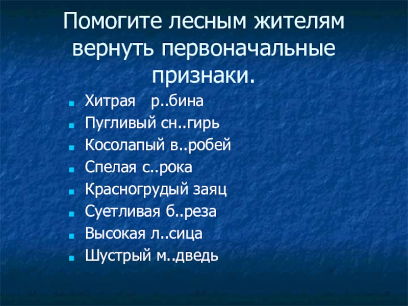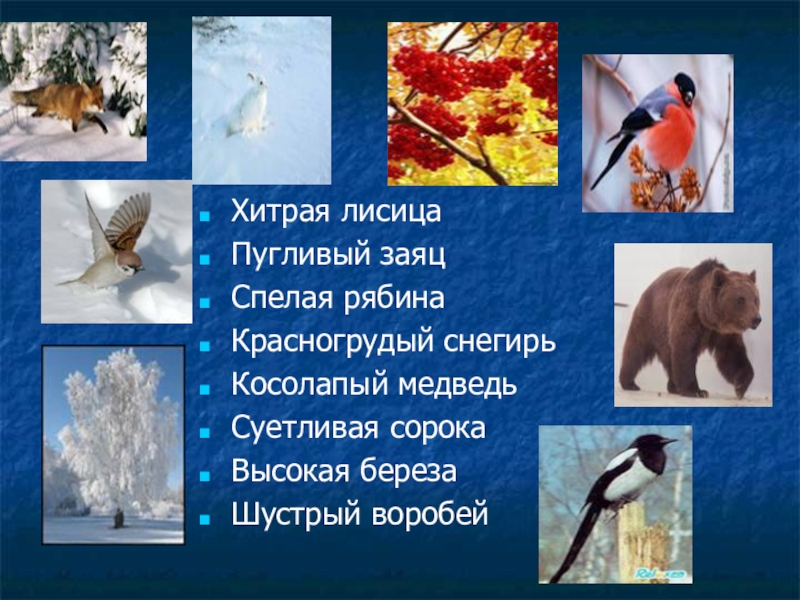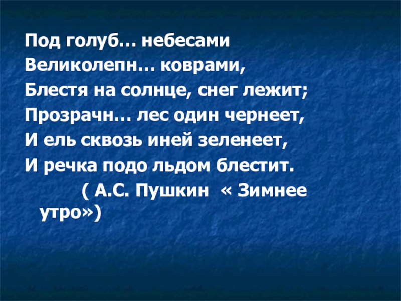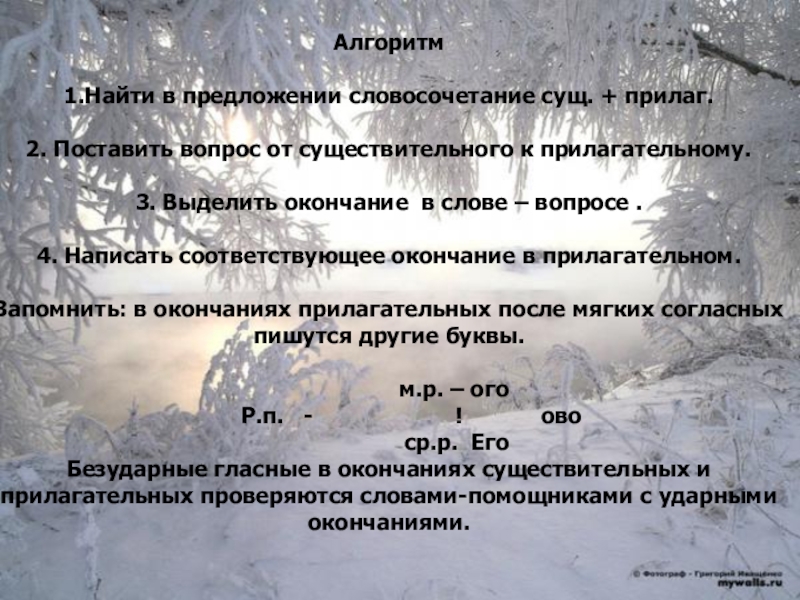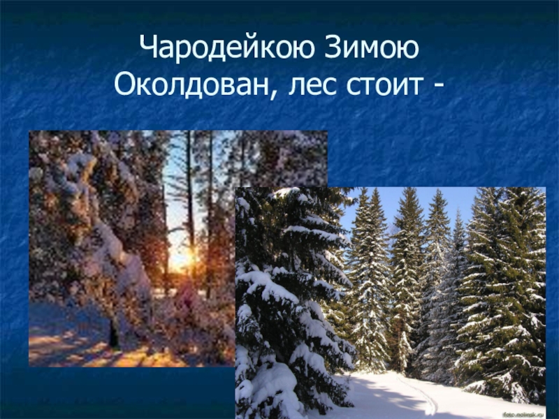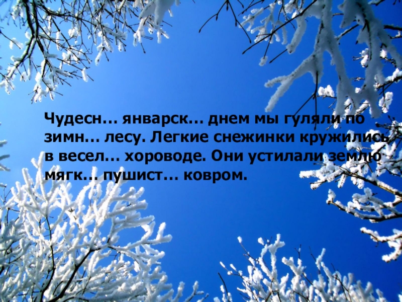 Чудесн… январск… днем мы гуляли по зимн… лесу. Легкие снежинки кружились в весел… хороводе. Они устилали землю мягк… пушист… ковром.