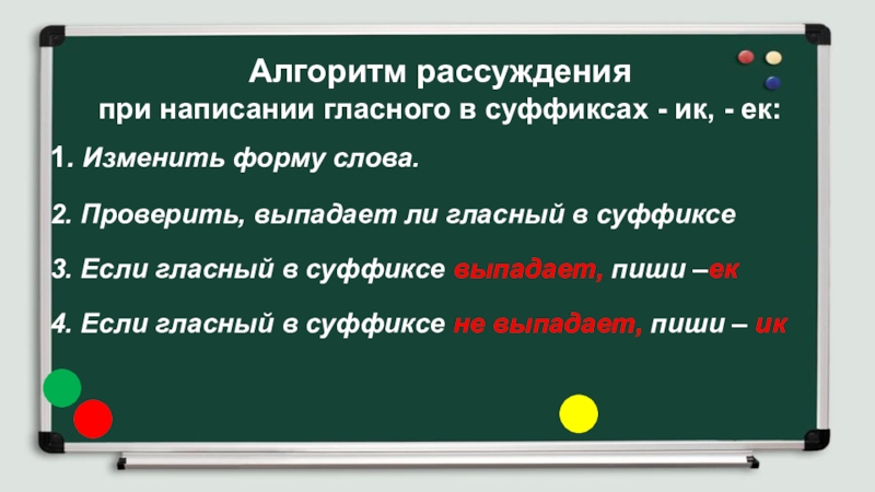 Алгоритм рассуждения  при написании гласного в суффиксах - ик, - ек:1. Изменить форму слова.2. Проверить, выпадает