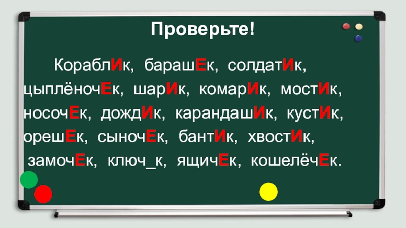 Проверьте!		КораблИк, барашЕк, солдатИк, цыплёночЕк, шарИк, комарИк, мостИк, носочЕк, дождИк, карандашИк, кустИк, орешЕк, сыночЕк, бантИк, хвостИк, замочЕк, ключ_к,