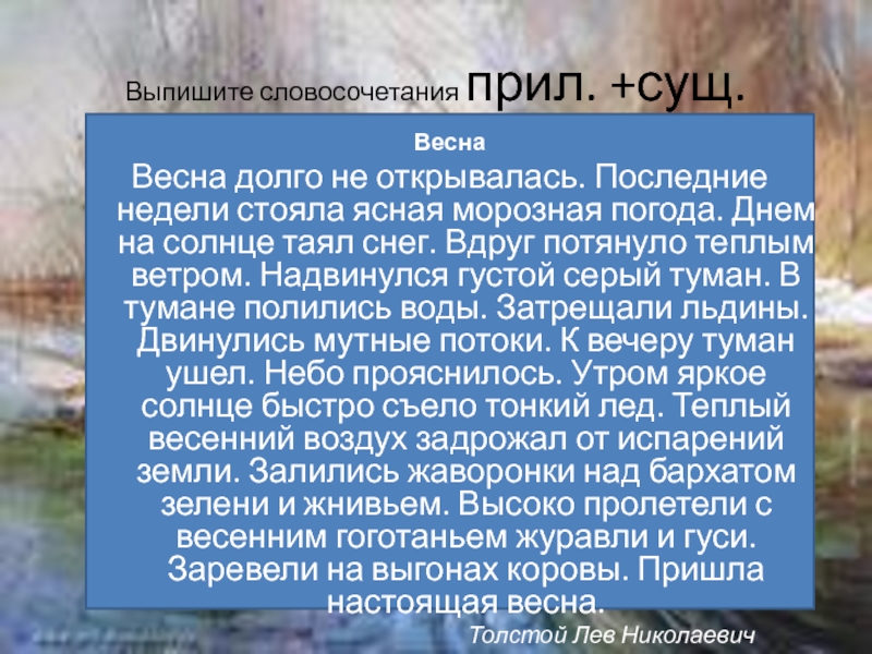 Выпишите словосочетания прил. +сущ.ВеснаВесна долго не открывалась. Последние недели стояла ясная морозная погода. Днем на солнце таял