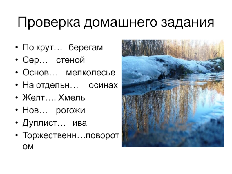 Проверка домашнего заданияПо крут… берегамСер… стенойОснов… мелколесьеНа отдельн… осинахЖелт…. ХмельНов… рогожиДуплист… иваТоржественн…поворотом