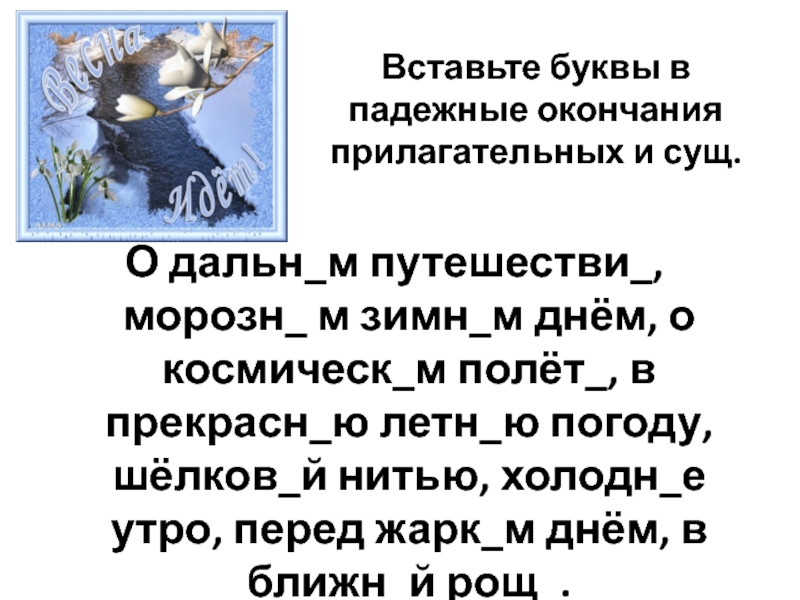 Вставьте буквы в падежные окончания прилагательных и сущ. О дальн_м путешестви_, морозн_ м зимн_м днём, о космическ_м полёт_, в
