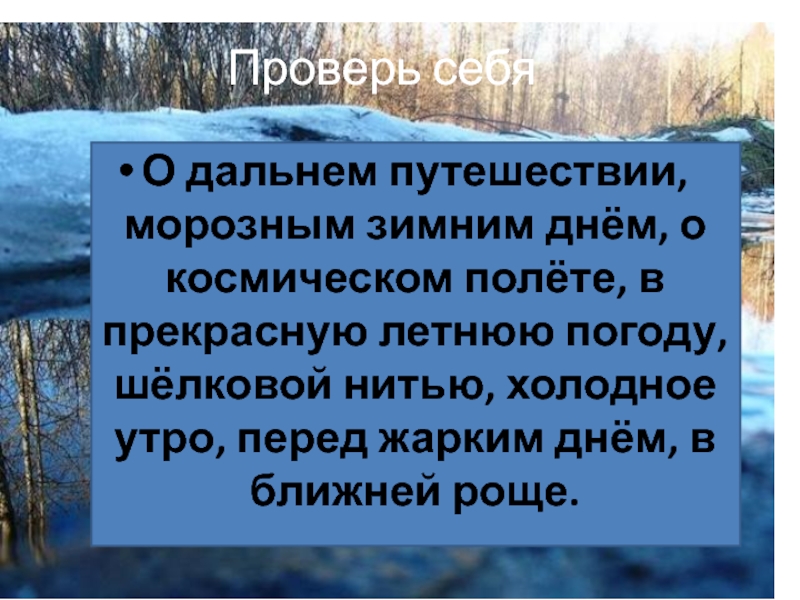 Проверь себяО дальнем путешествии, морозным зимним днём, о космическом полёте, в прекрасную летнюю погоду, шёлковой нитью, холодное