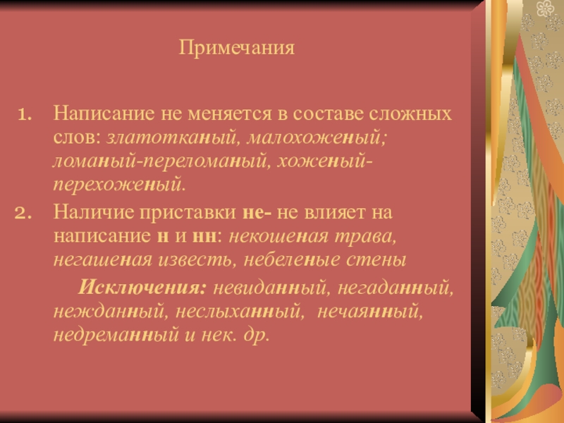 Исключения: невиданный, негаданный, нежданный, неслыханный, нечаянный, недреманный и нек. др.