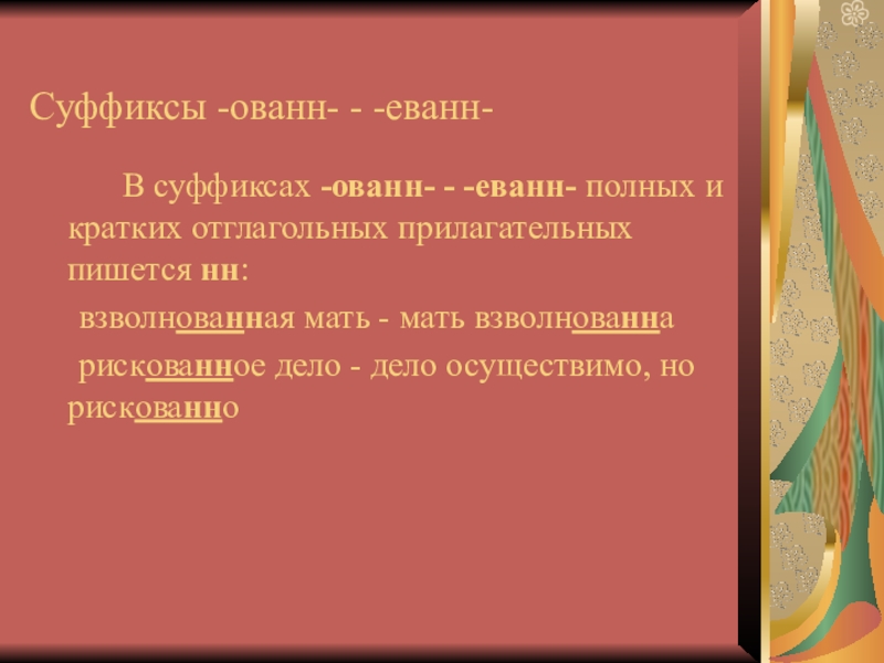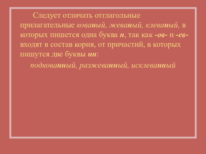 Слайд 19 Следует отличать отглагольные прилагательные кованый, жеваный, клеваный, в которых пишется одна